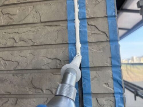 プライマーが乾燥したら、目地にコーキング材を充填していきます。適切な厚みを確保し、均一に充填することが耐久性アップのポイントです。