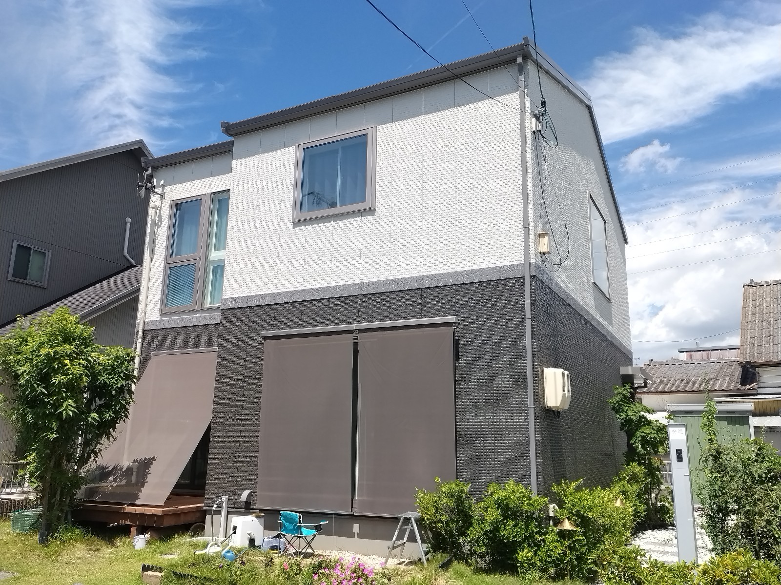 高耐候性シリコン塗料を採用し、耐久性と防水性を確保。さらに、デザイン面でも一新するため、1階部分は重厚感のあるダークグレー、2階部分は清潔感のあるホワイト系に塗り分けました。このツートンカラーにより、建物全体が引き締まり、現代的でおしゃれな外観へと生まれ変わりました。
