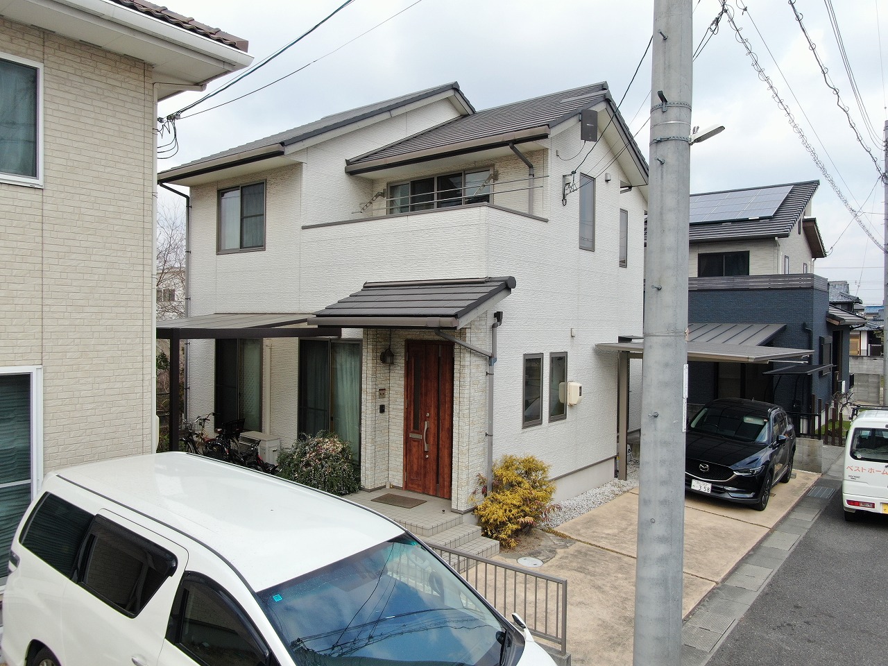 一見すると「同じような白系の外壁」に見えますが、実は今回の塗装は**色味を大きく変えずに仕上げた“同系色塗装”**になります。