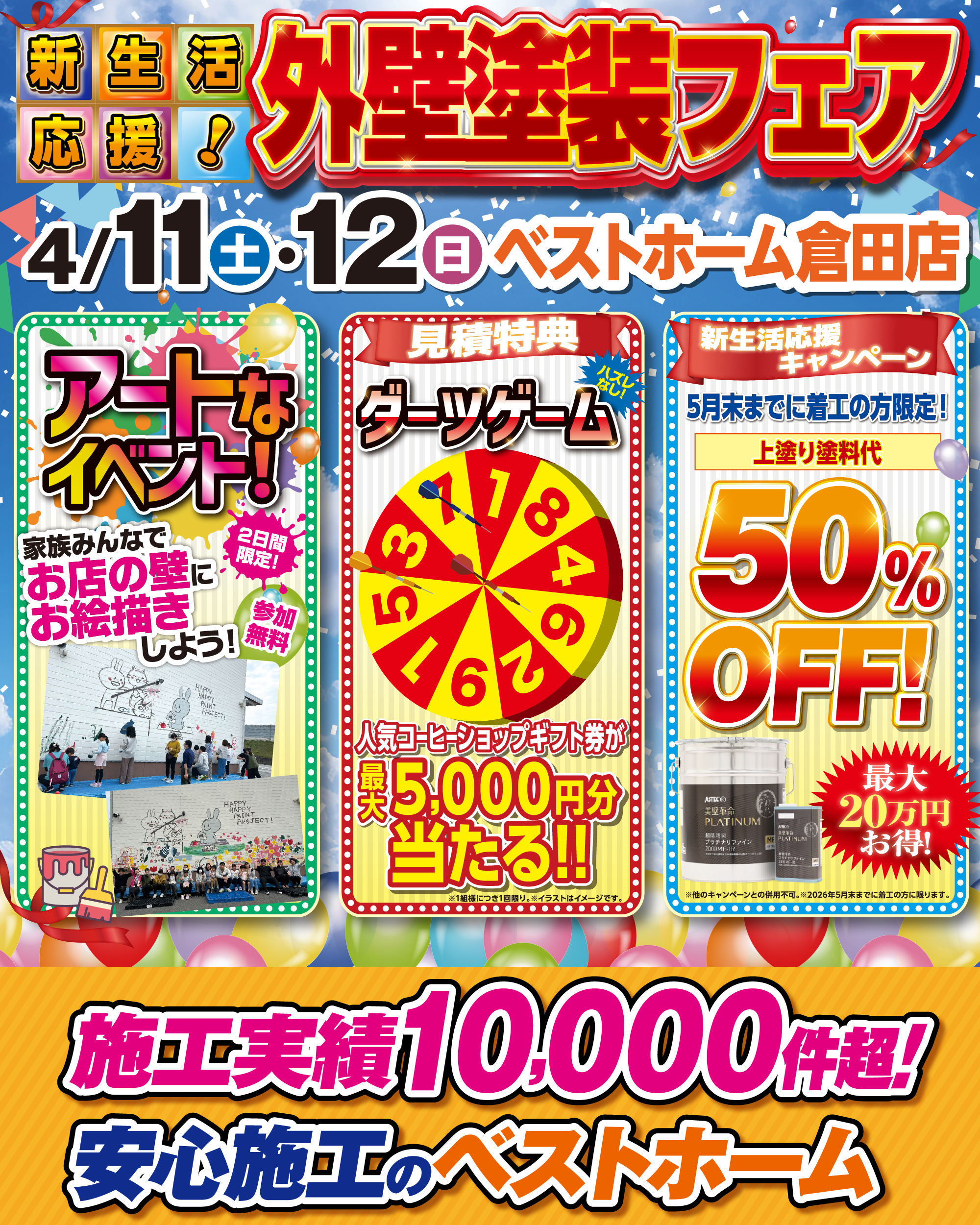 お得な特典や、この日しかできない大きな外壁に絵を描く催しも開催!!