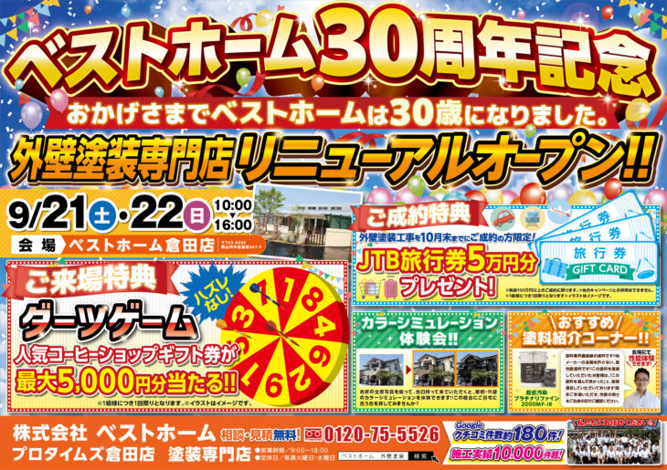ショールーム来店 無料見積り・相談 電話で見積り・相談 0120-755-526 【受付】9:00~18:00【定休日】火・水曜日 電話で見積り・相談 HOMEイベント・チラシ情報チラシ・掲載紙30周年リニューアルオープンイベント 30周年リニューアルオープンイベント(終了しました) 開催日時 2024年9月21日、22日(会場:ベストホーム倉田店) 詳しくはこちら > 会場 ベストホーム倉田店 会場住所 岡山県岡山市中区倉田387-3 開催日時 2024年9月21日、22日 参加費 無料 アクセスマップを確認する チラシ・掲載紙一覧はこちら イベント・チラシ情報一覧はこちら ベストホームについて 会社案内 選ばれる理由 アクセスマップ スタッフ紹介 来店ショールーム 受賞歴紹介 採用情報 施工事例 施工事例一覧 塗料別 シリコン塗料 超低汚染塗料 フッ素塗料 遮熱塗料 超防水塗料 その他 色別 白・クリーム色 濃色 淡色 ハウスメーカー別 ダイワハウス ミサワホーム セキスイハウス パナホーム その他 壁の種類別 モルタル 窯業系サイディング ALCパネル お客様の声 お客様の声一覧 お役立ち情報 外壁屋根診断 雨漏り診断 イベント・チラシ情報 おすすめ塗料 LINE相談 外壁塗装の流れ ブログ 一覧 外壁塗装コラム お問い合わせ お問い合わせ 無料お見積もり 資料請求 TOPに戻る ホーム 弊社について 会社案内 選ばれる理由アクセスマップスタッフ紹介来店ショールーム受賞歴紹介採用情報 施工事例 施工事例一覧 お客様の声 お客様の声一覧 よくある質問 お役立ち情報 外壁屋根診断雨漏り診断イベント・チラシ情報おすすめ塗料LINE相談外壁塗装の流れブログ 一覧外壁塗装コラム お問い合わせ お問い合わせ無料お見積もり資料請求
