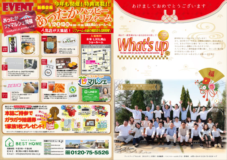 ショールーム来店 無料見積り・相談 電話で見積り・相談 0120-755-526 【受付】9:00~18:00【定休日】火・水曜日 電話で見積り・相談 HOMEイベント・チラシ情報What's upvol.40【特集】気になる対談~2019年のベストホーム~ vol.40【特集】気になる対談~2019年のベストホーム~(終了しました) ※クリックで拡大します(PDF)次回what’s up vol.41は花が咲き誇る3月発行予定です♪ 備考 気になる対談~2019年のベストホーム~ベストホームスタッフ2019年の抱負クローズアップベストホーム 大運動会ほかイベント情報 What's up一覧はこちら イベント・チラシ情報一覧はこちら ベストホームについて 会社案内 選ばれる理由 アクセスマップ スタッフ紹介 来店ショールーム 受賞歴紹介 採用情報 施工事例 施工事例一覧 塗料別 シリコン塗料 超低汚染塗料 フッ素塗料 遮熱塗料 超防水塗料 その他 色別 白・クリーム色 濃色 淡色 ハウスメーカー別 ダイワハウス ミサワホーム セキスイハウス パナホーム その他 壁の種類別 モルタル 窯業系サイディング ALCパネル お客様の声 お客様の声一覧 お役立ち情報 外壁屋根診断 雨漏り診断 イベント・チラシ情報 おすすめ塗料 LINE相談 外壁塗装の流れ ブログ 一覧 外壁塗装コラム お問い合わせ お問い合わせ 無料お見積もり 資料請求 TOPに戻る ホーム 弊社について 会社案内 選ばれる理由アクセスマップスタッフ紹介来店ショールーム受賞歴紹介採用情報 施工事例 施工事例一覧 お客様の声 お客様の声一覧 よくある質問 お役立ち情報 外壁屋根診断雨漏り診断イベント・チラシ情報おすすめ塗料LINE相談外壁塗装の流れブログ 一覧外壁塗装コラム お問い合わせ お問い合わせ無料お見積もり資料請求