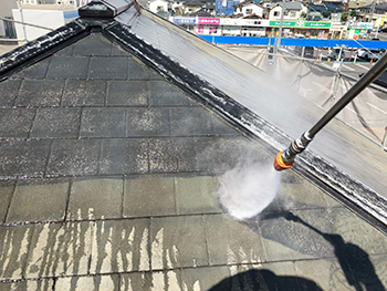 屋根も高圧洗浄を行います。塗料が密着しやすい状態にするための大切な作業です。