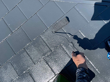屋根の中塗り(上塗り塗料1回目塗布)の様子です。