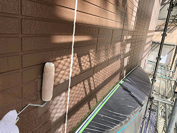 外壁の下塗りの様子です。下塗りは、屋根と同様に、外壁材と塗料の密着力を高める役割もあるので、塗装をする上で欠かせない作業です。