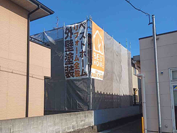 こちらは、外壁の中塗り(上塗り塗料1回目塗布)の様子です。