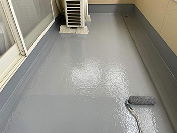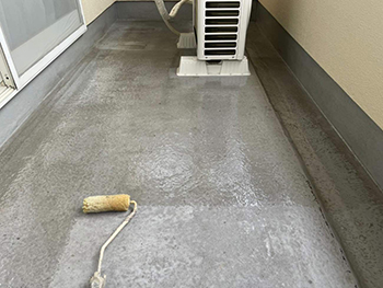 ベランダ防水施工の様子です。床表面にプライマーを塗布します。これによりトップコートと既存床の密着性が向上し、塗膜剥離を防ぎます。