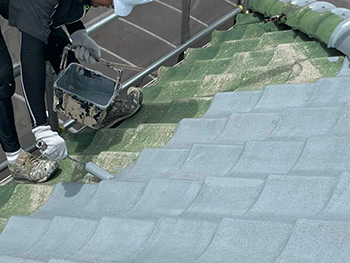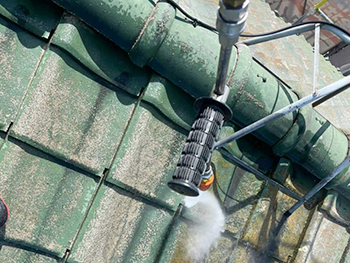 屋根の高圧洗浄の様子です。高圧洗浄を行うことで汚れや古い塗膜を洗い落としていきます。