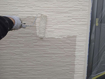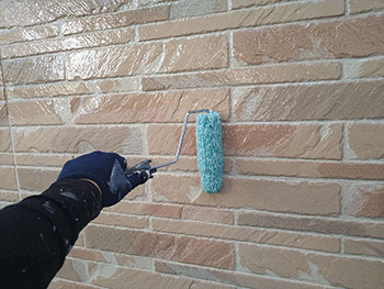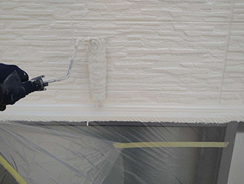 「シーラー」というさらっとした透明な下塗り材を塗布していきます。下塗り塗料を外壁材に染み込ませることで、上塗り塗料の吸い込みを抑え、上塗り塗料の塗膜の厚みを確保できる状態に整えます。