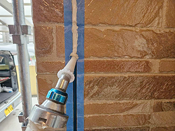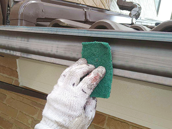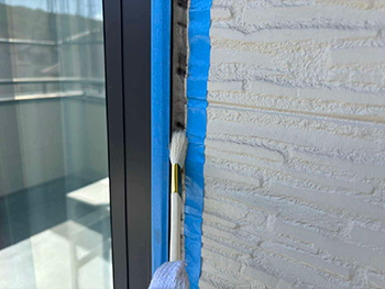 窓回りのシーリングは、既存のシーリングの上にシーリング材を重ね打ちする「増し打ち」を行います。写真は、既存のシーリングの上に下塗り材のプライマーを塗布している様子です。