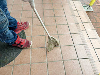 目地部分のシーリングは既存のシーリングを撤去し、新しいシーリングを充填する「打ち替え」を行います。写真は、既存のシーリングを撤去している様子です。