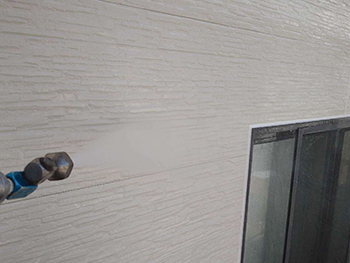 高圧洗浄を行うことで汚れや古い塗膜を洗い落とし、塗料が密着しやすい状態にします。