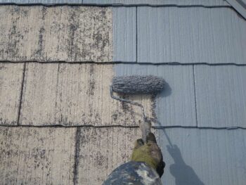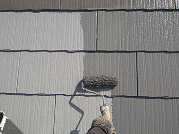 屋根の中塗りの様子です。下塗り完了後、同じ塗料を2回重ね塗りをすることで、塗膜の 厚みを確保します。