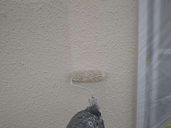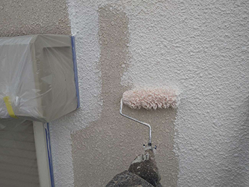 1階部分は、モルタルという種類の外壁なので、「フィラー」という粘度の高い塗料を使用します。表面の凹凸を滑らかにすることで上塗り塗料の厚みを均一にします。