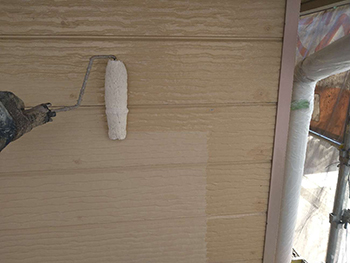 2階部分は、サイディングという種類の外壁なので、「シーラー」というさらっとした透明な下塗り材を塗布していきます。下塗り塗料を外壁材に染み込ませることで、上塗り塗料の吸い込みを抑え、上塗り塗料の塗膜の厚みを確保できる状態に整えます。