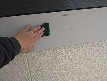 ケレン作業の様子です。樹脂などの表面がツルツルとした部材は塗料の付着が悪いので、ケレン作業により表面に細かな傷を付けて表面積を増やし塗装することが重要です。