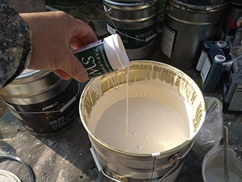 塗料は、主材と硬化剤を混ぜて使用する「2液型」というタイプです。塗料を使用する際には秤を使用して主材と硬化剤の割合を計測し、希釈量を遵守しています。