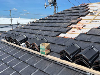 屋根の葺き替えの施工の様子です。 既存の屋根材を撤去し、下地の上に防水シートを張っていきます。