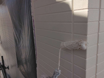 外壁には「シーラー」という下塗り材を塗布していきます。下塗り塗料を外壁材に染み込ませることで、上塗り塗料の吸い込みを抑え、上塗り塗料の塗膜の厚みを確保できる状態に整えます。