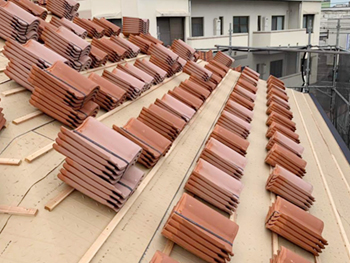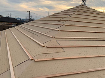 瓦を引っ掛けるために、屋根下地の上に一定の間隔で揃えて桟木と呼ばれる木材を取り付けます。