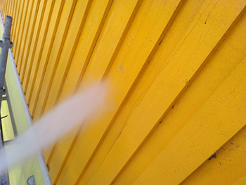 高圧洗浄を行うことで汚れや古い塗膜を洗い落とし、塗料が密着しやすい状態にします。
