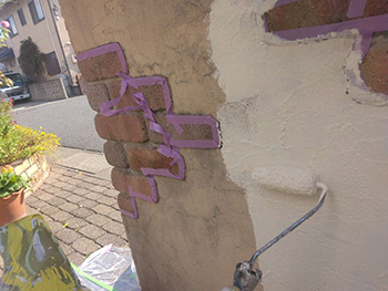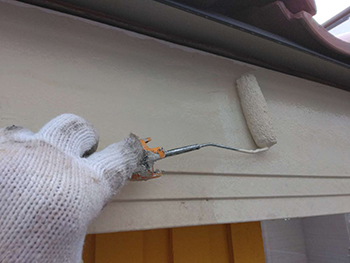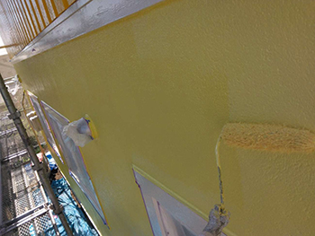 高圧洗浄後、外壁を塗装している様子です。 塗装は、下塗り1回、上塗り2回の3回塗りを行います。